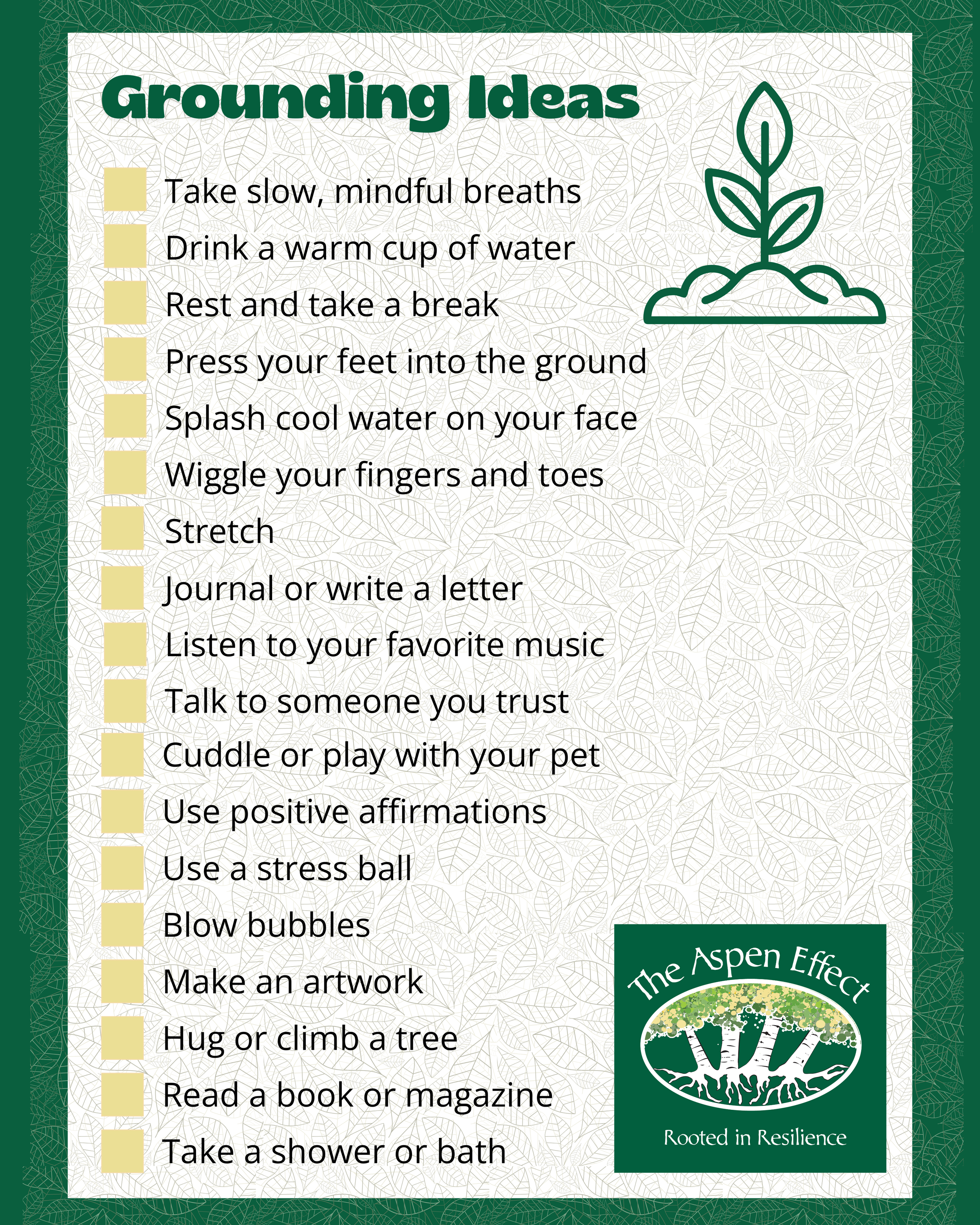 Feeling stressed or upset is something everyone experiences, especially when life feels busy or overwhelming. In our programs, we teach youth grounding skills to help them find calm and feel more in control. Grounding means bringing your attention to what is happening right now, instead of getting stuck in worries about the past or future. By focusing on the present moment, you can slow down racing thoughts and help your body relax.