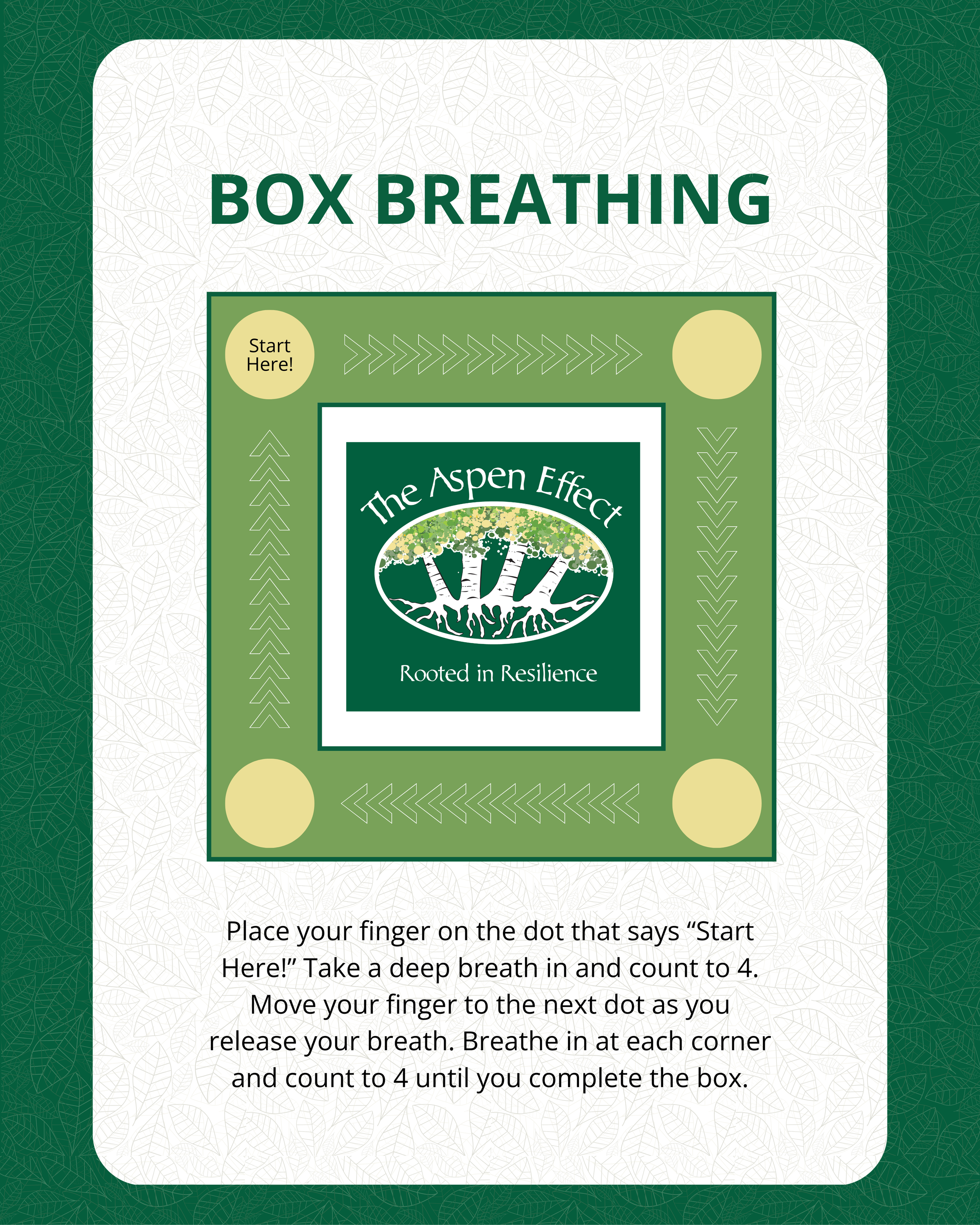 Box breathing is one of the tools we use to help youth feel more grounded and steady. We teach this skill in our camps and mentoring programs so participants have a simple way to calm their minds when life feels busy or heavy. Place your finger on the “Start Here” dot and follow the arrows. Breathe in for four counts and breathe out for four counts as you move around the box. This easy practice helps reset the body and build confidence over time.